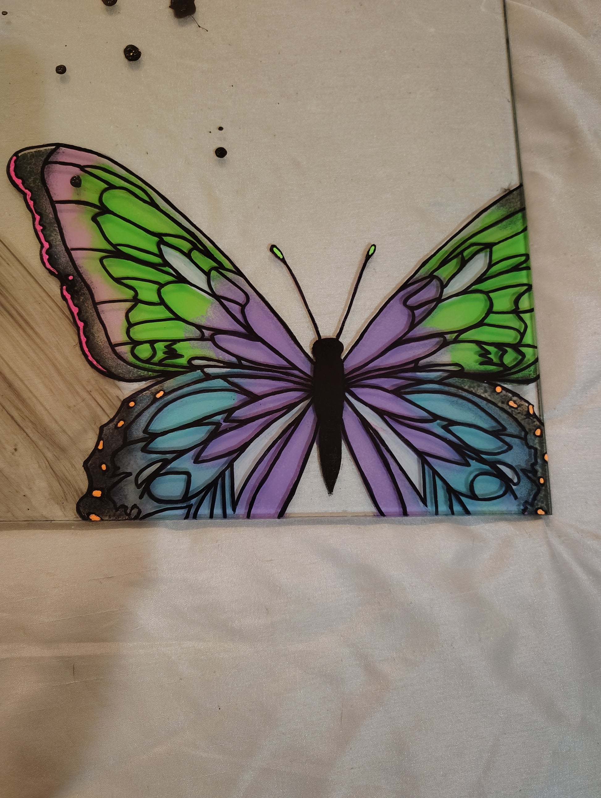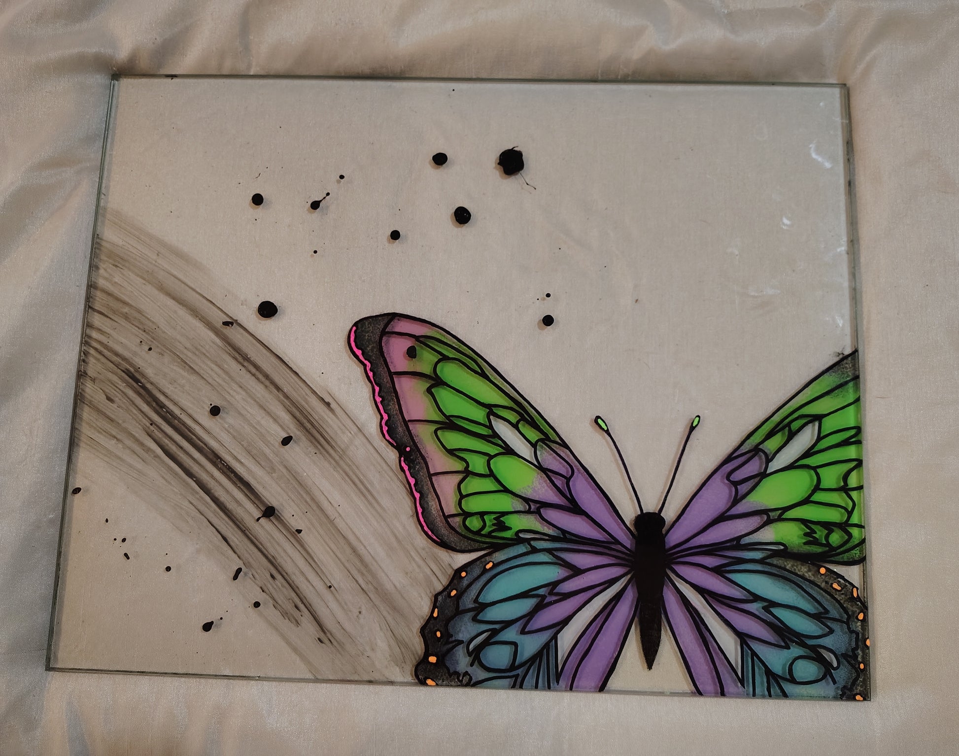 This one-of-a-kind reverse glass painting features a radiant butterfly brought to life with bold, luminous colors. The wings blend shades of green, purple, and blue with neon pink and orange accents that make the details glow against the clear glass. Black ink splatters and sweeping strokes add a raw, modern edge, giving the piece an expressive, urban-inspired energy.